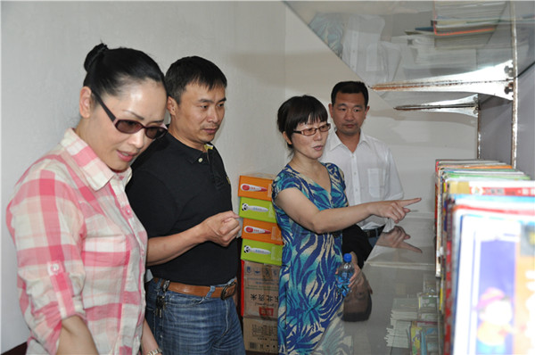 邵瑛(左一)、羊小慶(右一)等陪同徐智(右二)、龔文勇(左二)參觀惠民學校“婁底民盟圖書室”