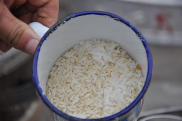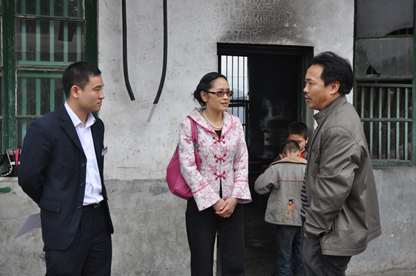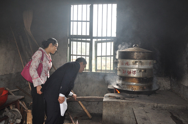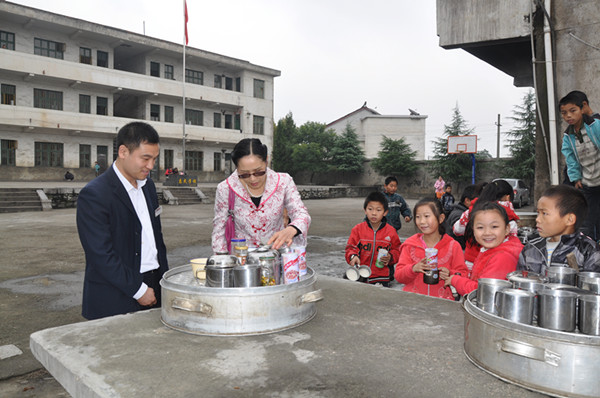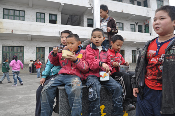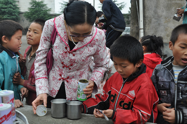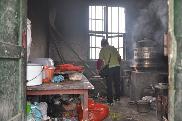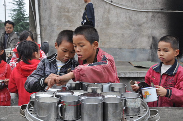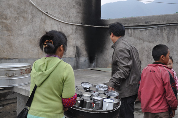 邵瑛一行走進狹小的食堂察看。一間不到6平方米的房子里,西南角有一個磚砌的灶,灶膛里正在燃燒的柴火熏得人睜不開眼,從上午9點開始,食堂師傅就要為全校近200名師生下米蒸飯;東面是一排用木板搭起的簡易操作面,北面窗戶下用磚頭做支架、木板做臺面搭了個臺子,上面放了個小電磁爐,給教師炒菜用。飯蒸好了,校長和工友將蒸籠抬到室外的水泥乒乓球臺上,100多個大小、高矮不一的學生蜂擁而至,找到自己的飯碗或杯子,將早晨從家里帶來的、已經冰涼的壇子菜或蔬菜,與飯攪和在一塊,這就是一個孩子的中餐了。還有幾個學生蒸飯用的杯子因破舊漏水,飯只有七、八成熟。看著孩子們狼吞虎咽的樣子,邵瑛一行人心酸得眼淚都掉下來了。