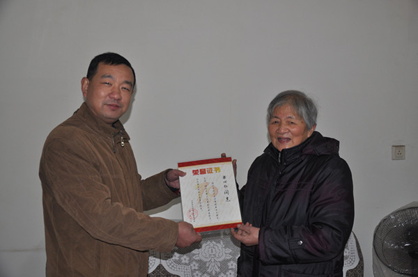 羊小慶(左)代表民盟省委為梁心仁(右)頒發榮譽證書