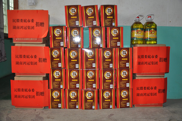 民盟婁底市委、鴻冠集團贈送的植物油及餅干