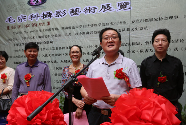 9月13日,中國民主同盟盟員、婁底市政協委員、婁底市著名攝影家毛宗科攝影藝術展在婁底市新星茶樓開幕,展出了毛宗科近年來60多幅精品力作。本次攝影展由民盟婁底市委、婁底市商務局、婁底市文聯主辦,中共婁底市委常委、婁底市委宣傳部長伍美華宣布攝影展開幕。婁底市政協副主席、民盟婁底市委主委邵瑛致開幕詞,婁底市政協副主席譚懷連主持開幕式,婁底市政協副主席劉志偉,中南出版集團副總經理、湖南文藝出版社社長劉清華,中共婁底市委統戰部常務副部長李友元,婁星區代區長黃大生等領導出席開幕式并剪彩。數百攝影愛好者、盟員和群眾前來參觀展覽。