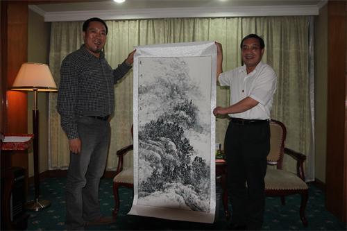 羅湘科(左)向張寶文主席(右)贈送國畫《溪山雪境》。郭國權攝