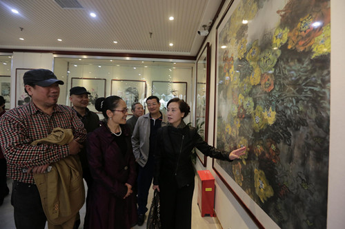 民盟婁底市委藝術委員會的盟員認真觀賞了畫展,并同歐陽慧齡就國畫藝術