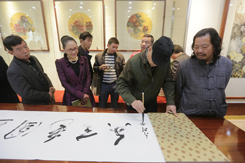11月21日,民盟婁底市委主委、政協副主席卲瑛觀看盟員顏彥峰為歐陽慧玲畫展題詞。