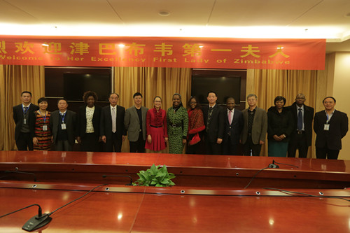 邵瑛(左7)和格蕾絲·穆加貝(中)一行合影留念
