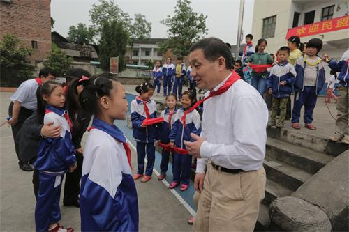 楊維剛還與學生進行了親切交流,詢問他們的學習、生活情況,希望他們健康成長,長大后做一個對社會有用的人。孩子們為遠道而來的客人系上了紅領巾。