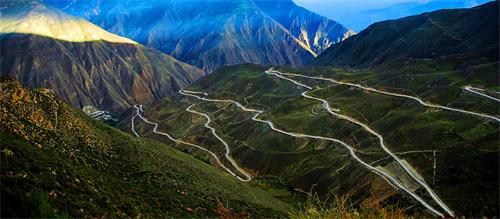 9月21日8:30從江達縣城出發(fā),途經(jīng)年拉山(海撥3469米),浪拉山(海撥4572米)等雪山。經(jīng)過浪拉山時,正好下雨,山上到處都有崩落下來的石塊,一路走來提心吊膽。如果運氣好,一旦山上掉下石塊來,也許就永遠扎根西藏了。但過了浪拉山,進入業(yè)拉山(海撥4658米)時,已是晴空萬里,艷陽高照。翻過業(yè)拉山,下山那邊也就是有名的72拐(也有說99拐的)。此時,正值夕陽西下,72拐與對面的山峰相映成輝,構(gòu)成了一幅美好的圖畫。下了72拐已是晚上9點多,一路都是塌方,幸好已經(jīng)疏通,不然也會到這住上10天半月。晚上趕到八宿縣城住宿。