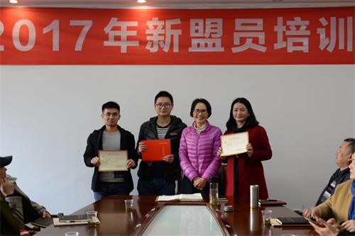 邵瑛(右2)給新盟員發放“入盟通知書”