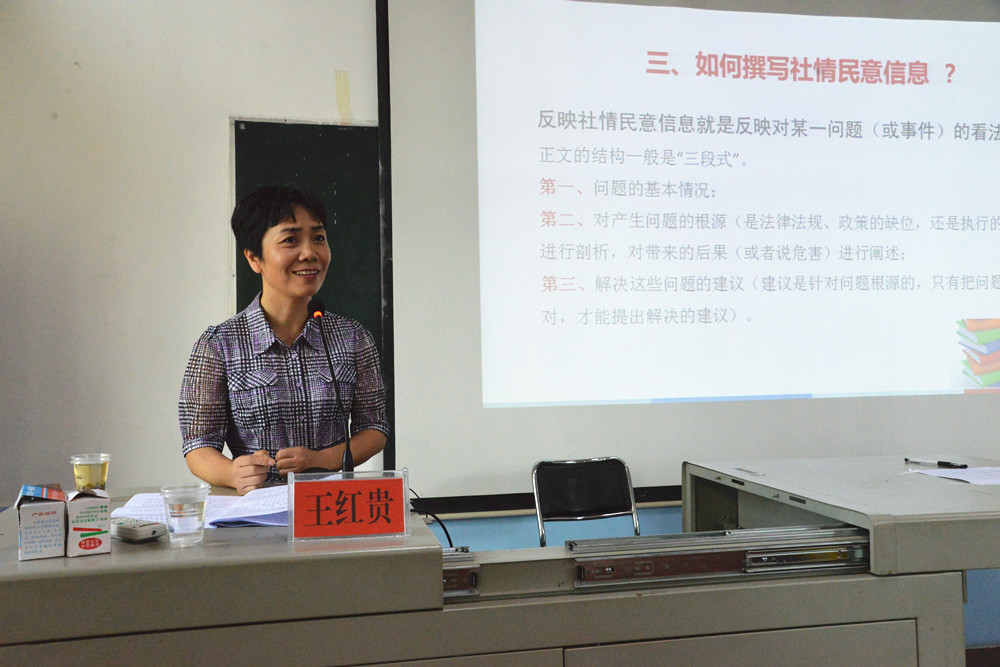 反映社情民意是民主黨派成員履行參政議政職能的重要方式。在全市民主黨派新成員培訓(xùn)班上,王紅貴結(jié)合工作實(shí)際,從“為什么要寫(xiě)社情民意信息”、“社情民意信息寫(xiě)什么”、“怎樣寫(xiě)社情民意信息”三個(gè)方面,深入淺出地為大家講述了社情民意信息的撰寫(xiě)方法。課后,王紅貴應(yīng)邀出席基層組織負(fù)責(zé)人座談會(huì),并對(duì)各黨派學(xué)員代表的發(fā)言進(jìn)行了點(diǎn)評(píng)。她肯定了基層組織負(fù)責(zé)人的黨派情懷和無(wú)私奉獻(xiàn)精神,希望大家學(xué)有所獲,學(xué)有所用,為婁底市的多黨合作事業(yè)做出更大的貢獻(xiàn)。