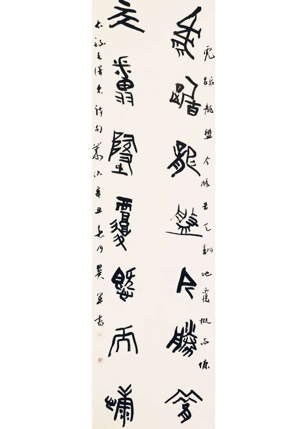 作品簡介:金文書毛澤東《七律·人民解放軍占領南京》中"虎踞龍盤今勝昔,天翻地覆慨而慷"詩句,筆意雄奇,以求渾樸高古、峻秀勁健、奇逸飛動、天然率真之氣息,表達詩人面對南京天翻地覆、今勝往昔的變化,心潮澎湃、慷慨激昂的革命豪情。