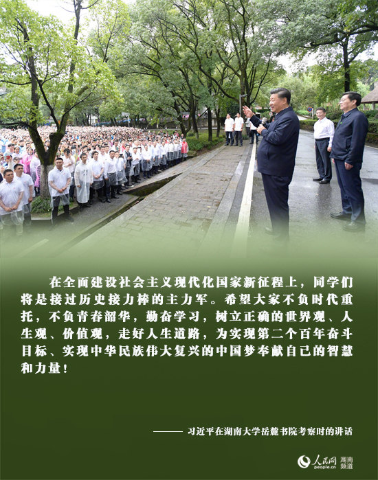 岳麓書院位于長(zhǎng)沙岳麓山腳下、湖南大學(xué)校園內(nèi),是一所創(chuàng)建于北宋年間的千年學(xué)府。習(xí)近平來到這里考察調(diào)研,了解人才培養(yǎng)、文化傳承等情況。書院里,習(xí)近平同正在開展思政課現(xiàn)場(chǎng)教學(xué)的師生們親切交流。他強(qiáng)調(diào),要把課堂教學(xué)和實(shí)踐教學(xué)有機(jī)結(jié)合起來,充分運(yùn)用豐富的歷史文化資源,緊密聯(lián)系中國(guó)共產(chǎn)黨和中國(guó)人民的奮斗歷程,深刻領(lǐng)悟馬克思主義中國(guó)化的內(nèi)在道理,深刻領(lǐng)悟?yàn)槭裁礆v史和人民選擇了中國(guó)共產(chǎn)黨和社會(huì)主義,進(jìn)一步堅(jiān)定“四個(gè)自信”。