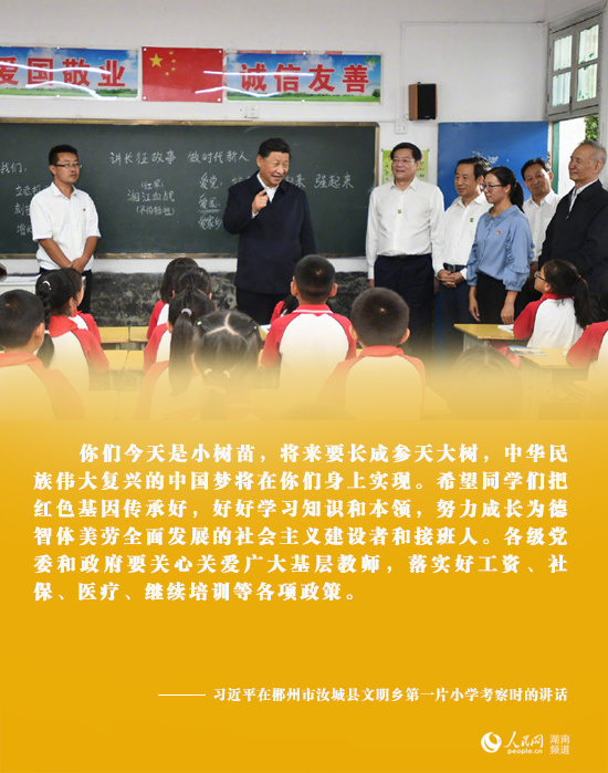 習(xí)近平接著來到文明瑤族鄉(xiāng)第一片小學(xué),走進(jìn)廚房、儲(chǔ)藏間,察看學(xué)生餐營(yíng)養(yǎng)搭配和食品安全。四年級(jí)的同學(xué)們正在上思政課,看到總書記走進(jìn)來,齊聲向習(xí)爺爺問好。習(xí)近平對(duì)同學(xué)們說,你們今天是小樹苗,將來要長(zhǎng)成參天大樹,中華民族偉大復(fù)興的中國(guó)夢(mèng)將在你們身上實(shí)現(xiàn)。希望同學(xué)們把紅色基因傳承好,好好學(xué)習(xí)知識(shí)和本領(lǐng),努力成長(zhǎng)為德智體美勞全面發(fā)展的社會(huì)主義建設(shè)者和接班人。各級(jí)黨委和政府要關(guān)心關(guān)愛廣大基層教師,落實(shí)好工資、社保、醫(yī)療、繼續(xù)培訓(xùn)等各項(xiàng)政策。