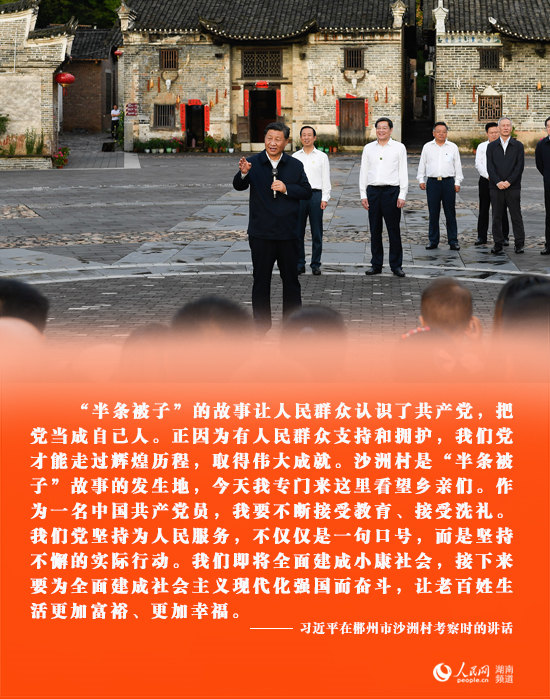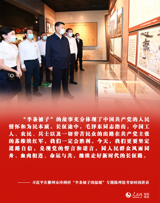 16日下午,習(xí)近平首先來到郴州市汝城縣文明瑤族鄉(xiāng)沙洲瑤族村考察調(diào)研。1934年,紅軍長(zhǎng)征路過這里,留下了“半條被子”的感人故事。習(xí)近平走進(jìn)“半條被子的溫暖”專題陳列館,了解當(dāng)?shù)丶訌?qiáng)基層黨的建設(shè)、開展紅色旅游和紅色教育情況。習(xí)近平指出,“半條被子”的故事充分體現(xiàn)了中國(guó)共產(chǎn)黨的人民情懷和為民本質(zhì)。長(zhǎng)征途中,毛澤東同志指出,中國(guó)工人、農(nóng)民、兵士以及一切勞苦民眾的出路在共產(chǎn)黨主張的蘇維埃紅軍,我們一定會(huì)勝利。今天,我們更要堅(jiān)定道路自信,兌現(xiàn)黨的誓言和諾言,同人民群眾風(fēng)雨同舟、血肉相連、命運(yùn)與共,繼續(xù)走好新時(shí)代的長(zhǎng)征路。