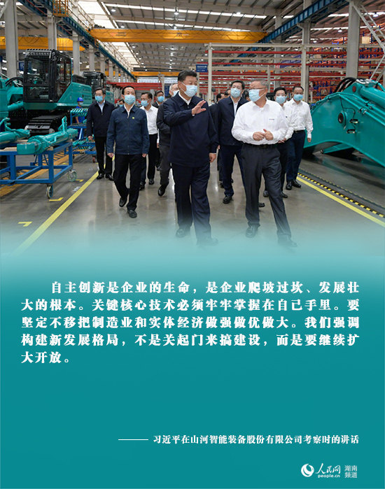 17日下午,習(xí)近平在長(zhǎng)沙市考察調(diào)研。山河智能裝備股份有限公司是一家裝備制造領(lǐng)域的龍頭企業(yè),產(chǎn)品行銷全球。習(xí)近平來到公司生產(chǎn)車間,察看裝備制造流程,了解技術(shù)研發(fā)、生產(chǎn)制造情況,對(duì)他們的創(chuàng)新精神表示贊賞。習(xí)近平強(qiáng)調(diào),自主創(chuàng)新是企業(yè)的生命,是企業(yè)爬坡過坎、發(fā)展壯大的根本。關(guān)鍵核心技術(shù)必須牢牢掌握在自己手里。要堅(jiān)定不移把制造業(yè)和實(shí)體經(jīng)濟(jì)做強(qiáng)做優(yōu)做大。我們強(qiáng)調(diào)構(gòu)建新發(fā)展格局,不是關(guān)起門來搞建設(shè),而是要繼續(xù)擴(kuò)大開放。