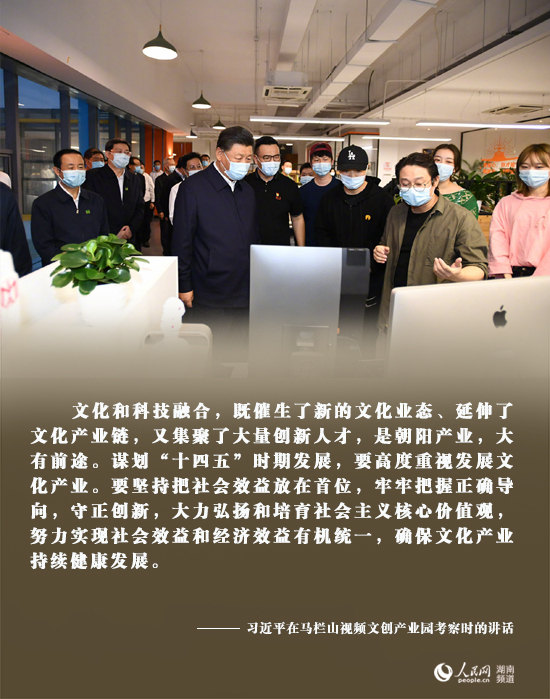 馬欄山視頻文創(chuàng)產(chǎn)業(yè)園以數(shù)字視頻創(chuàng)意為龍頭,匯集了各類文創(chuàng)企業(yè)3000多家。習(xí)近平來到產(chǎn)業(yè)園,考察園區(qū)開展企業(yè)黨建和內(nèi)容生產(chǎn)、技術(shù)研發(fā)、人才培養(yǎng)等。習(xí)近平指出,文化和科技融合,既催生了新的文化業(yè)態(tài)、延伸了文化產(chǎn)業(yè)鏈,又集聚了大量創(chuàng)新人才,是朝陽產(chǎn)業(yè),大有前途。謀劃“十四五”時(shí)期發(fā)展,要高度重視發(fā)展文化產(chǎn)業(yè)。要堅(jiān)持把社會(huì)效益放在首位,牢牢把握正確導(dǎo)向,守正創(chuàng)新,大力弘揚(yáng)和培育社會(huì)主義核心價(jià)值觀,努力實(shí)現(xiàn)社會(huì)效益和經(jīng)濟(jì)效益有機(jī)統(tǒng)一,確保文化產(chǎn)業(yè)持續(xù)健康發(fā)展。