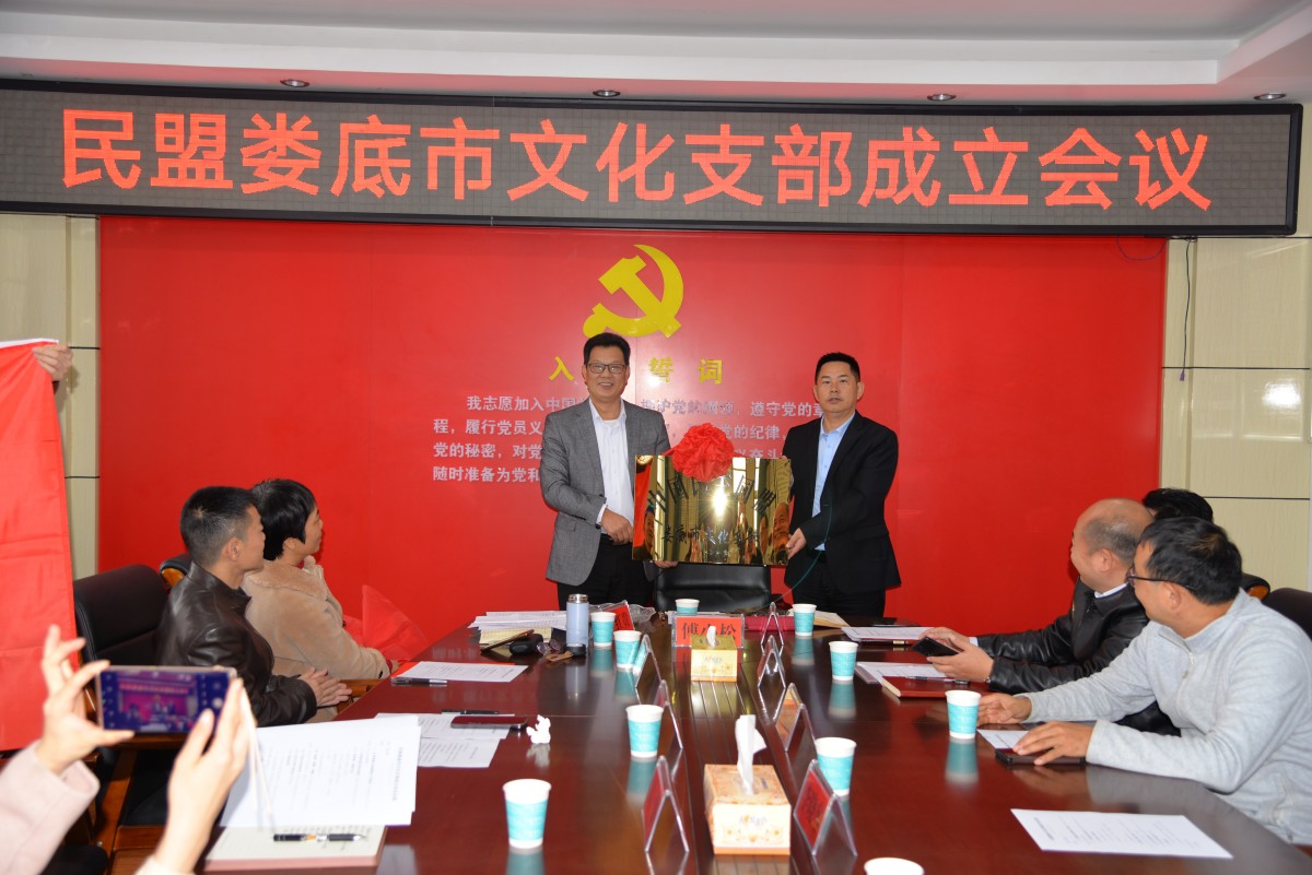 傅小松為民盟婁底市文化支部授章、授牌、授旗,并代表民盟婁底市委會對民盟婁底市文化支部的成立表示熱烈祝賀。他指出,民盟婁底市文化支部的成立是婁底民盟發展史上的一件大事,也是市文旅廣體局統戰工作、多黨合作工作中一件喜事。他希望,全體盟員一要學政治、講政治。全面學習、全面把握、全面貫徹習近平新時代中國特色社會主義思想和中共二十大精神,深刻認識"兩個確立"的決定性意義,增強“四個意識”、堅定“四個自信”、做到“兩個維護”,與黨同心、同向、同行;二要興文化、強文化。立足本職崗位,努力創造優秀文化作品、產品,推進文化事業、文化產業,推進以文化人、以文惠民、以文興業;三要鉆盟務、精盟務。努力做好參政議政、社會服務和組織建設等各項工作。