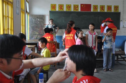 民盟婁底市委委員、市中心醫院支部主委、醫院急診中心主任李文華等10多名盟員醫務工作者,遠赴漣源市斗笠山鎮惠民學校,為孩子們做一年一次的義務體檢。孩子們經過前兩次體檢后,已經比較熟悉體檢流程了,相當配合。體檢結束后,眼科專家還孩子們講授了沙眼防治等眼科知識。