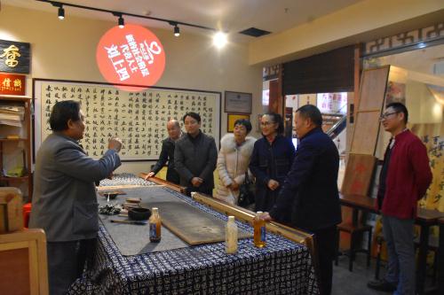 在雨花非遺館,邵瑛一行詳細了解了非遺館的建設、運營情況,與民盟盟員、雨花非遺館董事長郭存勇,民盟盟員、中國甲骨文書法藝術研究會副會長謝兆崗,民盟盟員、古琴大師王穎,洪氏剪紙傳承人洪源等親切交談,并現場欣賞了他們的技藝表演。