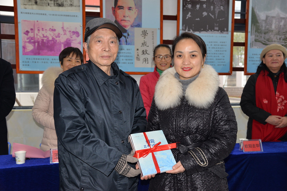 歐陽吉華(左)向?qū)W校捐贈《刻瓷藝術(shù)與技法》100本