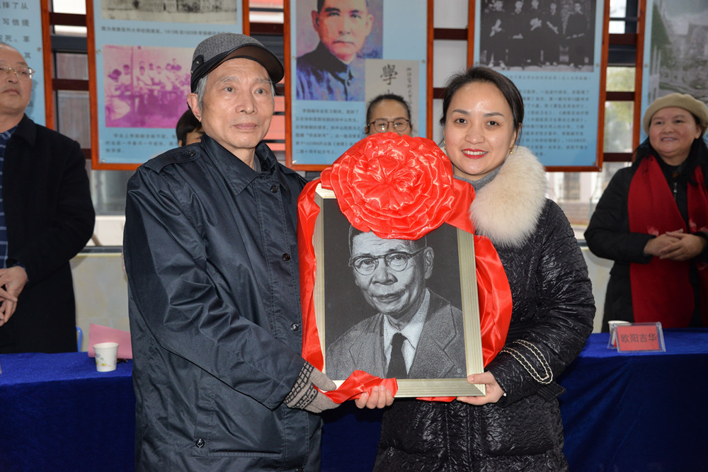 歐陽吉華(左)向?qū)W校捐贈李振翩刻瓷肖像